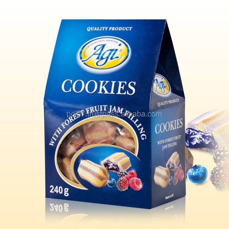 Ingredients: flour, sugar, vegetable oils, egg powder, vanilla, forest fruit jam 26%(fruit content – 35%, raspberries, blackberries, blueberries, glucose – fructose syrup, citric acid E330, pectin E440, ), food colour E122, E132, raising agents E450, E500. May contain traces of nuts!