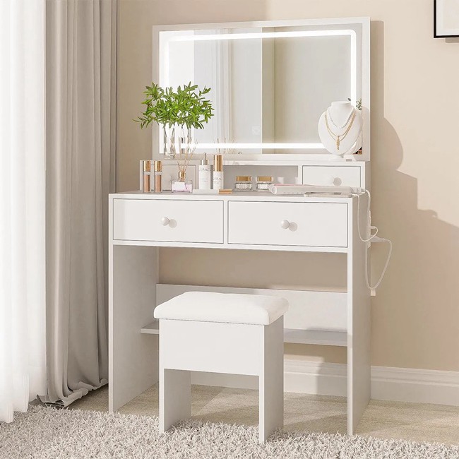 The design of the modern vanity table takes full account of the user's needs, integrating storage, lighting and decoration. Multi-drawer, open lattice, mirror cabinet and other designs, so that all kinds of cosmetics, skin care products, jewelry and other items can be placed in an orderly manner, not only easy to access but also to keep the countertop clean. The adjustable LED mirror light can provide sufficient and even light when applying makeup, making every detail invisible and helping you create a perfect makeup.